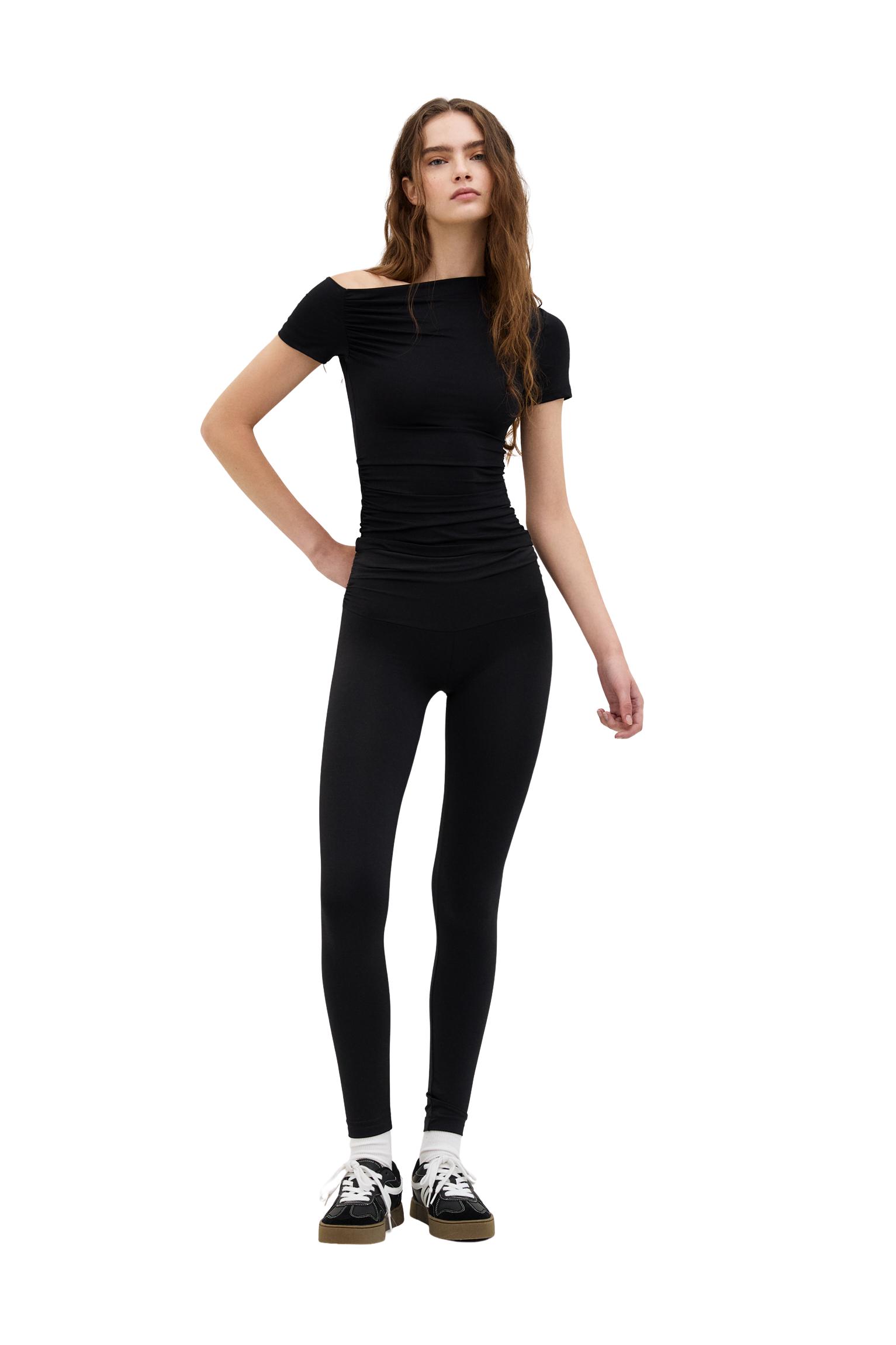 Fitted leggings with gathered detail at the waist. Made of very stretchy polyamide fabric.